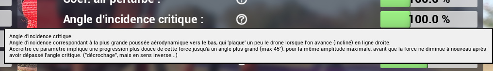 J’ai obtenu des résultats très corrects après avoir importé des fichiers de blackbox, mais ça reste un point de départ. Pour obtenir le meilleur comportement possible, il faudra retravailler le modèle à la main. C’est l’un des points fort de AI Drone Simulator, à l’instar de Velocidrone le comportement du drone et la physique peuvent être ajustés de manière très précise. Ce qui m’a demandé le plus de correction c’est la gestion du drone dans le bas des gaz, il était un peu difficile à contrôler dans les espaces étriqués comme l’intérieur des bâtiments. Il y a eu plusieurs améliorations au fil de nos tests et des versions. C’est vraiment pas mal par défaut maintenant, mais si vous êtes dans la même situation, voici quelques conseils :