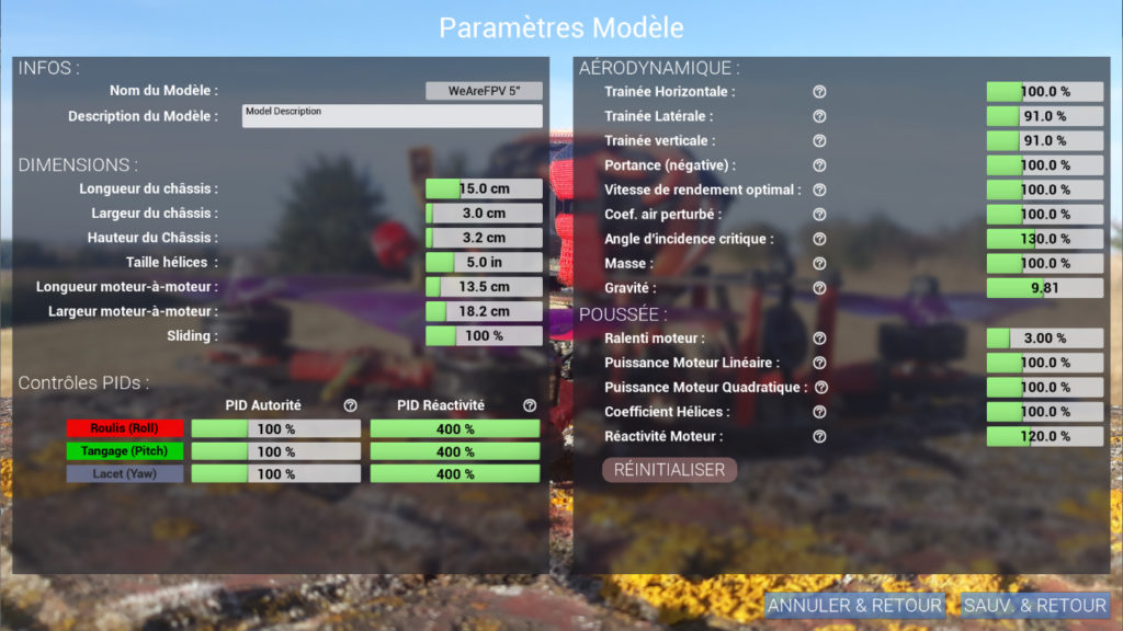 A noter que vous ne retrouverez pas la notion de PIDs telle qu’on la connait pour nos quads ou sur certains simulateurs. Les PIDs permettent d’aider le contrôleur de vol à s’adapter à la machine physique dans laquelle il est installé, pour qu’il fasse son travail le mieux possible. Dans une simulation, ce n’est pas utile, sauf si on a besoin d’émuler un mauvais comportement du quad, avec du rebond ou un manque de réactivité. Ce qui reste possible sur AI Drone Simulator avec les 2 « curseurs de PIDs ». Les modèles sont évidement régis par des paramètres, mais les classiques P, I et D ne sont pas disponibles depuis l’interface.