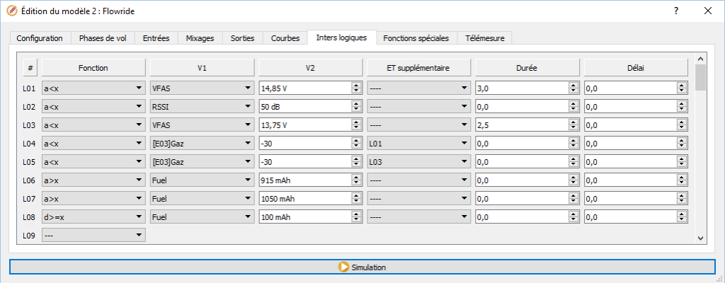 L01 : l’interrupteur logique L01 est actif lorsque la tension de la LiPo est inférieur à 14,80V pendant au moins 3 secondes.