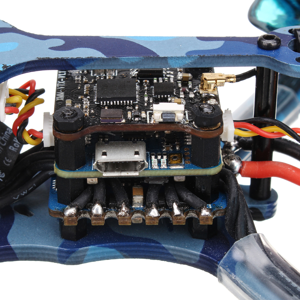 Au second étage on retrouve le contrôleur de vol lui aussi compatible 4S. Il est propulsé par un CPU de type F4 et s’appuie sur un gyroscope MPU6000 SPI pour capter les mouvements du miniquad. Sur la carte on retrouve également un OSD actif (qui permet de régler BetaFlight et l’émetteur vidé) ainsi qu’un BEC 5V/2A. Il est un poil plus petit que les ESCs avec seulement 25 x 25 mm et 2,3 grammes.
