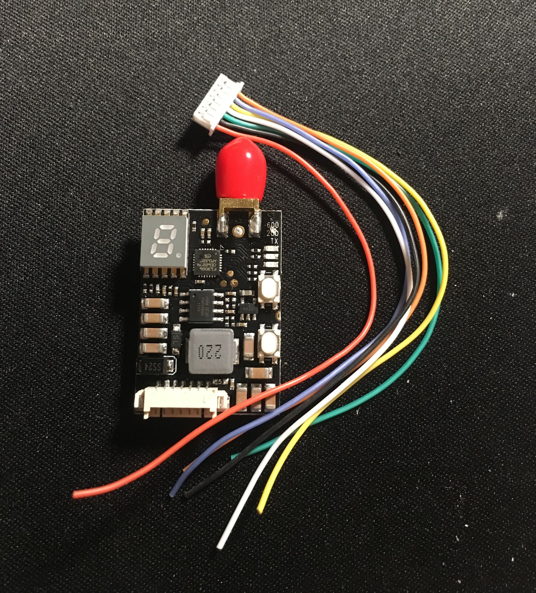 Oui, vous avez bien lu, TBS SmartAudio ! Ce petit vTx fait autant de chose qu’un Unify a 35€ ! Je possède un Unify pro 5V sur mon Chameleon et je l’adore même si l’affichage avec une LED c’est vraiment insupportable. Heureusement qu’on peut utiliser un script sur la Taranis pour modifier les réglages. Sur celui de eWRF un afficheur 7 segments, 3 LEDs ainsi que deux boutons sont disponibles pour plus de commodité. L’afficheur donne la bande et le canal alors que les LEDs nous informent sur la puissance.