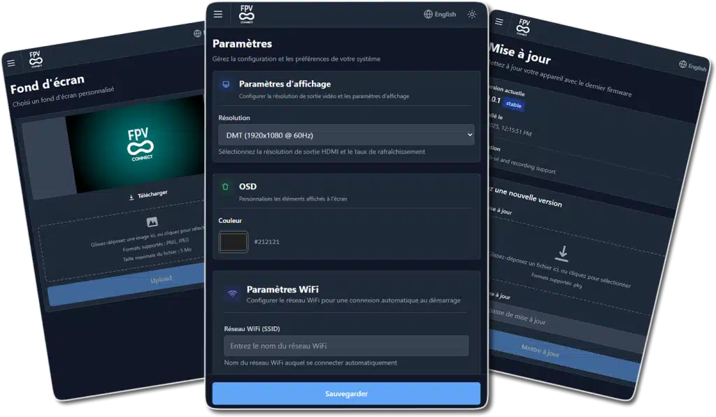 FPVConnect se veut simple d’usage mais propose tout de même un configurateur accessible en Wi-Fi pour ajuster la résolution, la fréquence d’image, le fond d’écran ou encore les paramètres réseau.
