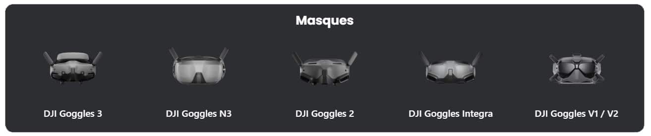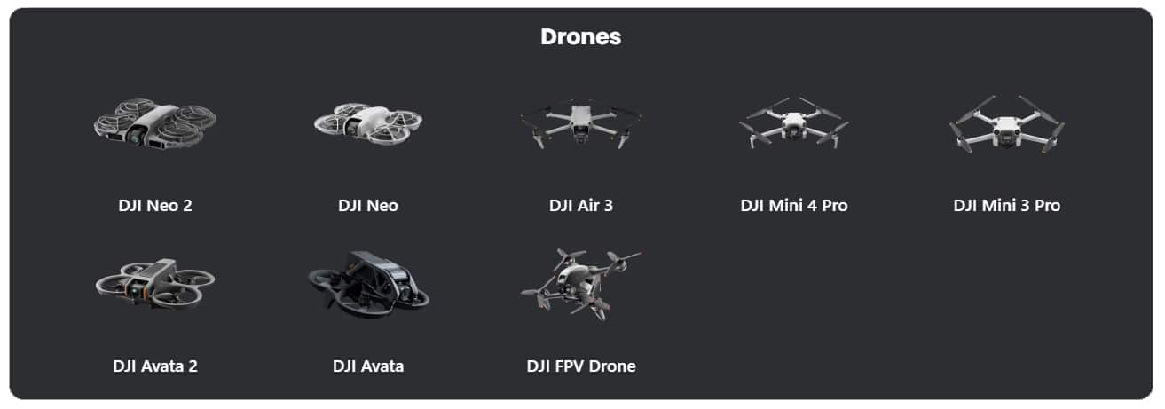 Les pilotes qui préfèrent les drones stabilisés aux racers DIY ne sont pas laissés pour compte avec une longue liste de modèles compatibles, du plus récent au plus ancien : DJI Neo 2, DJI Neo, DJI Air 3, DJI Mini 4 Pro, DJI Mini 3 Pro, DJI Avata 2, DJI Avata et DJI FPV Drone.