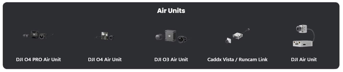 Niveau vTx c’est pareil, FPVConnect couvre du bon vieux Air Unit V1 au dernier O4 (Pro), en passant par les Caddx Vista / Runcam Link et O3.