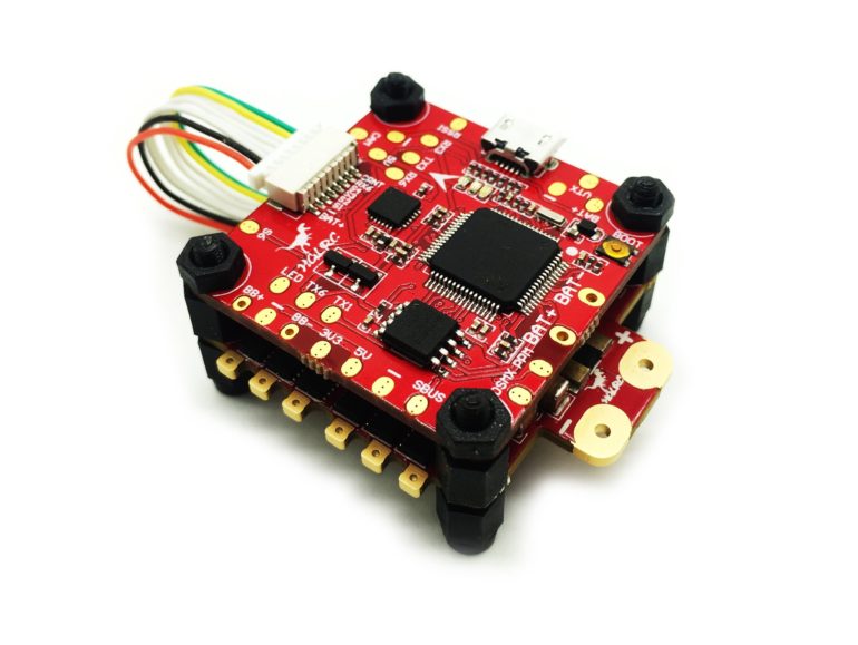 L’AirbusF4OSD repose sur un processeur de type F4 pour faire tourner BetaFlight en 8K / 8K, très certainement en target OMNIBUSF4 (il n’y a pas de firmware Airbus). Le gyroscope est quant à lui un MPU6000-SPI. Il s’agit d’une carte de vol très complète puisqu’elle embarque une Blackbox de 16Mo, un OSD actif et un BEC 5V/ 3A. Pour finir, elle s’alimente le plus simplement du monde en direct LiPo 2 à 6S !