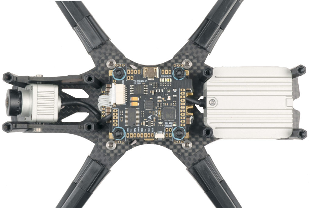 Il y a notamment un OSD et un régulateur filtré pour offrir le retour FPV le plus clean possible. Le tout s’agence évidemment parfaitement à l’intérieur du châssis.