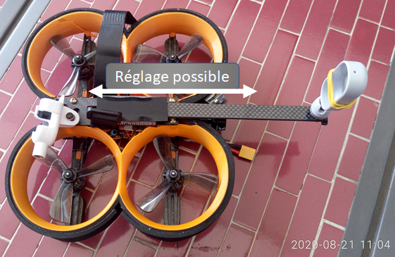 Plus on reculera la caméra, et plus elle recevra de vibrations et affectera le comportement du drone. Il faut donc trouver le meilleur compromis : celui qui permettra d’avoir assez de recul sans pour autant induire trop de vibrations. Tout en gardant en tête que le support doit être aussi discret que possible.