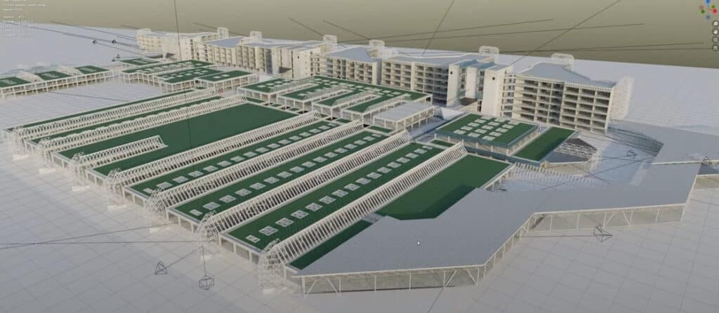 Il s’agit d’un complexe hospitalier inachevé gigantesque, d’une longueur de près de 700 mètres.