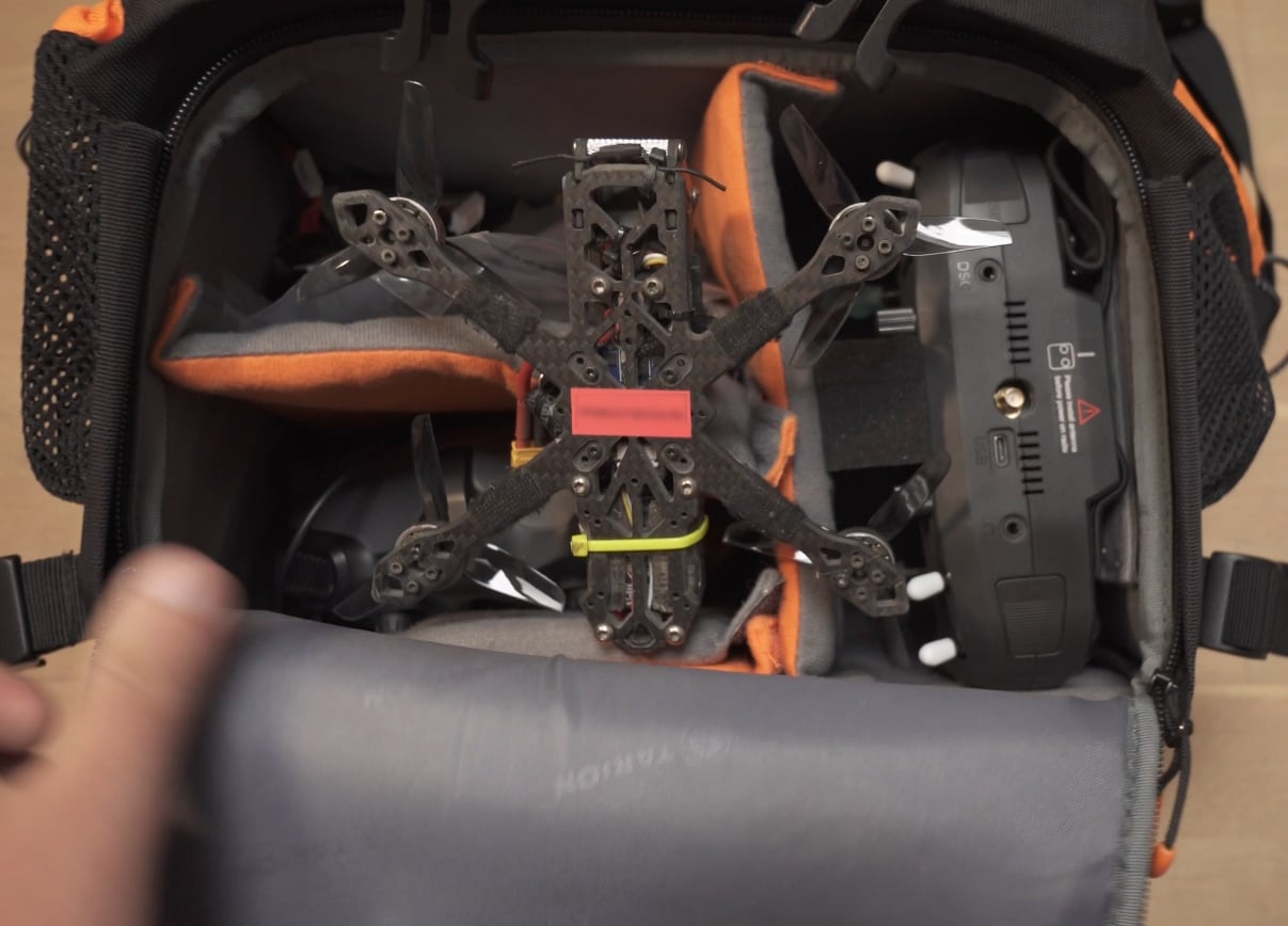 Tout d’abord pour la randonnée. Tout le matériel rentre dans le bas du sac : lunettes, radio, LiPos et le Jeno 3″ ! Ca passe large, sans que rien ne soit visible à l’extérieur du sac.