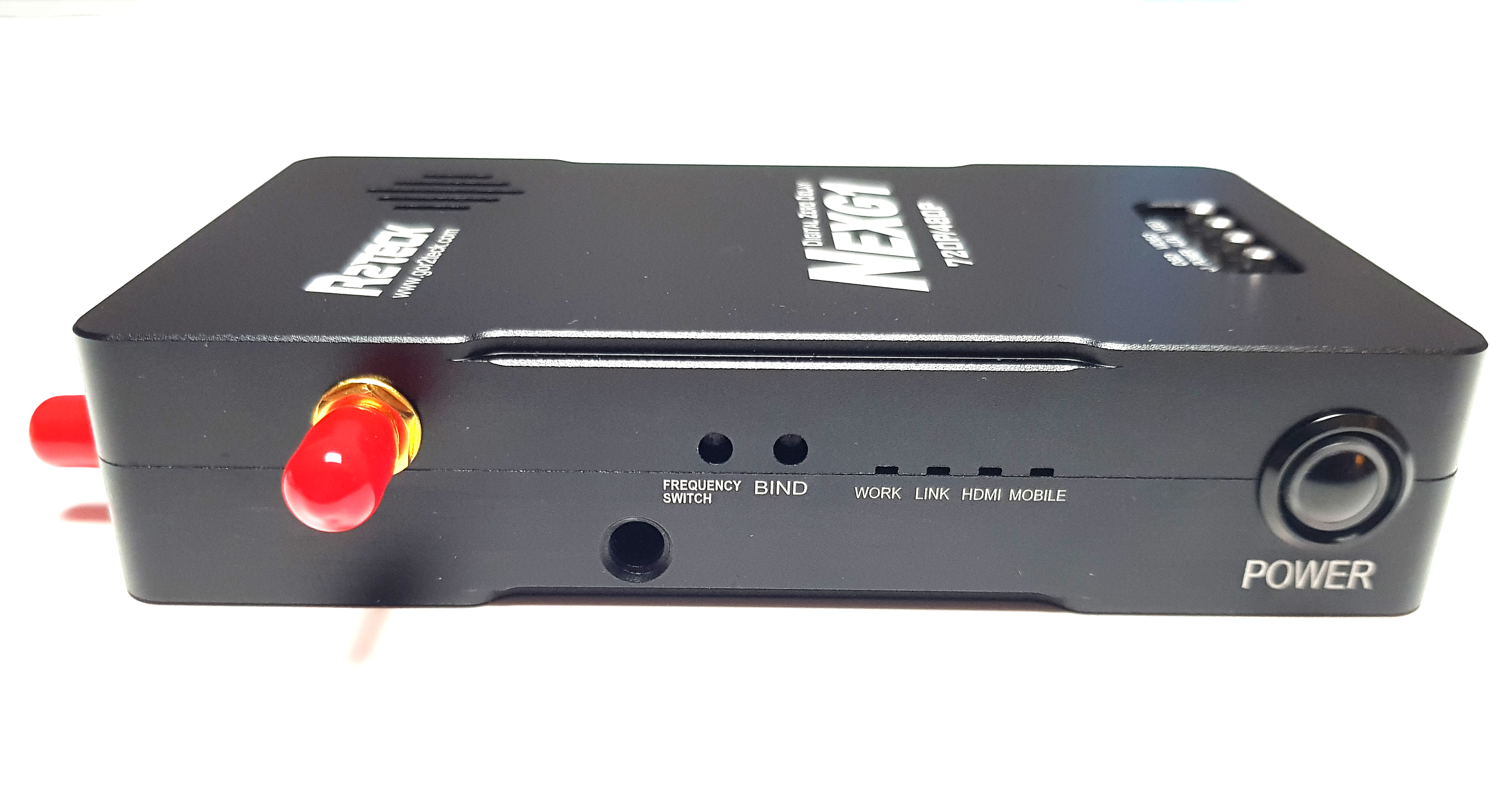 D’un côté on retrouve 4 LEDs témoins qui indiquent l’état du récepteur, l’état de la connexion radio, l’état de la connexion HDMI et l’état de la connexion mobile (oui, il y a une application mobile, on y reviendra ci-dessous). A leur côté il y a également une prise d’antenne, un bouton d’alimentation, un bouton pour changer de fréquence et un dernier pour le bind évoqué précédemment.
