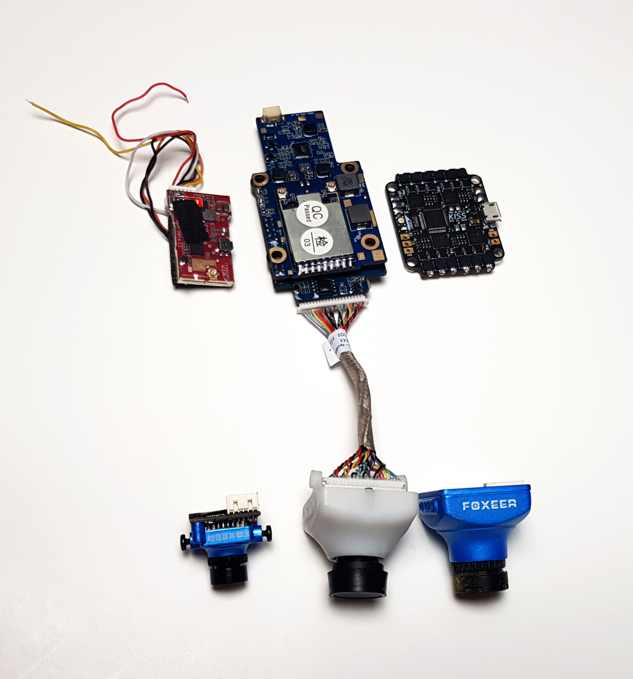 Le vTx et la caméra nous ont été livrés déjà branchés. D’après la notice chaque extrémité du câble se connecte à un des 2 périphériques bien précis. L’émetteur est composé de 2 cartes soudées entre elles dont l’épaisseur totale dépasse légèrement les 10mm. L’équipement occupe donc une place considérable dans une stack d’électronique à l’heure de la miniaturisation et du low rider. En longueur c’est encore pire, on approche les 7cm. Cependant, la version de production sera moins encombrante comme vous pourrez le voir sur une photo plus bas sur cette page.