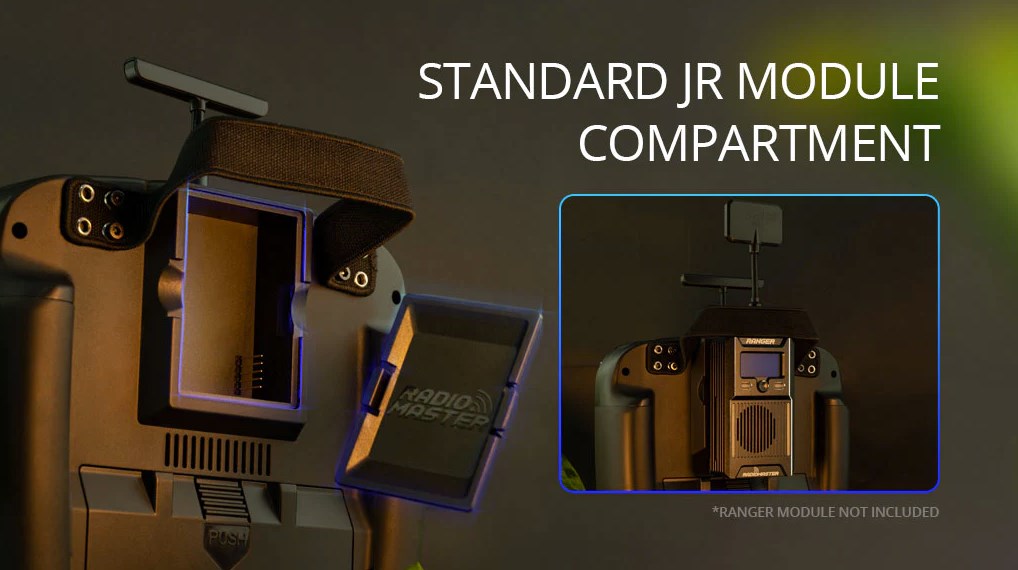 Finalement, pour satisfaire tout le monde, Radiomaster a aussi prévu une baie JR au format standard qui pourra par exemple accueillir un Tx CrossFire, Tracer ou encore Ghost.