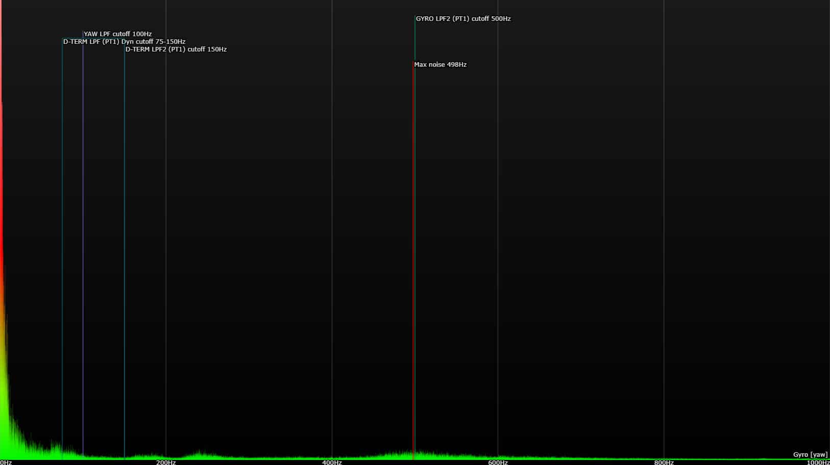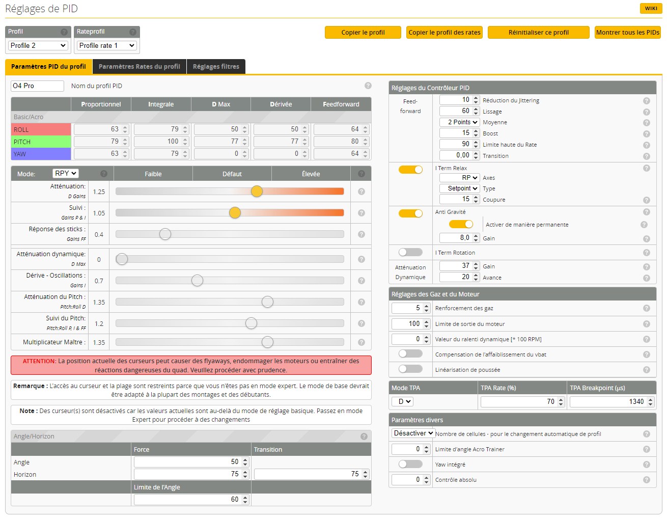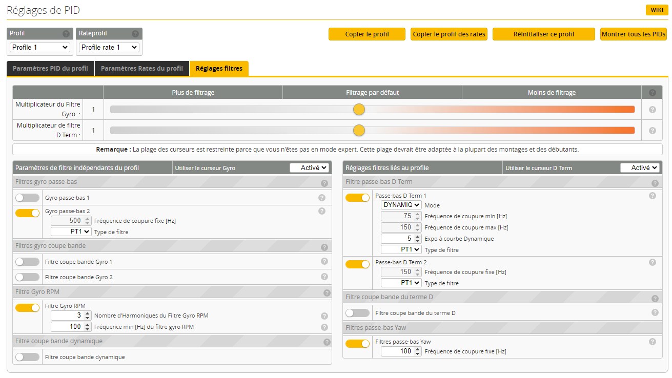 Le filtrage est quant à lui stock, mais le bruit étant plutôt élevé comme c’est souvent le cas sur les whoops de ce type, c’est plus prudent, d’autant plus qu’on ne recherche pas la performance pure.