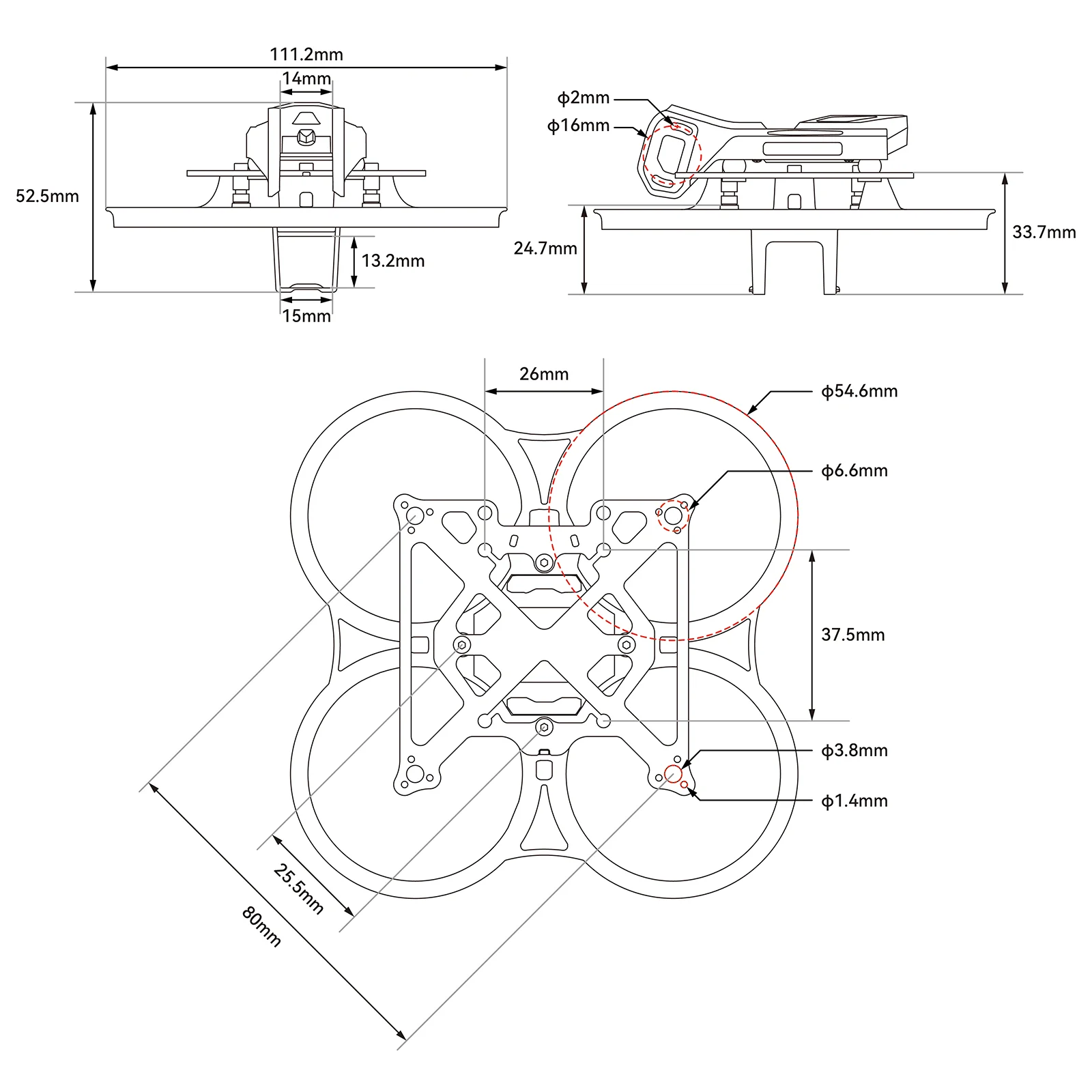 Les ducts (protections d’hélices) se retirent en quelques secondes après avoir devissé quatre vis. On a ainsi accès à l’électronique sans retirer les moteurs. Ces derniers sont reliés à la FC AIO sans soudure, avec des connecteurs facilitant le remplacement en cas de besoin.