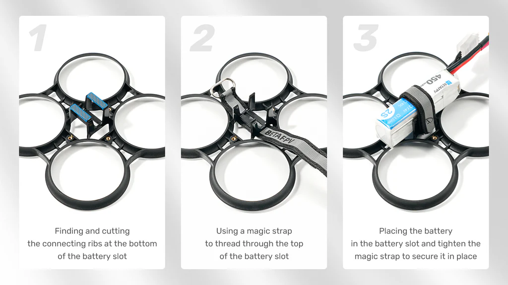 BetaFPV préconise les LiHV LAVA 2S 550mAh ou 450mAh en 2S à 75C pour son Pico II. Les batteries s’installent dans une nacelle de taille fixe (16 × 12,7 mm). Toutefois, pour ceux qui voudraient utiliser des batteries de capacité et/ou de marque différentes, la documentation explique comment passer sur un strap :