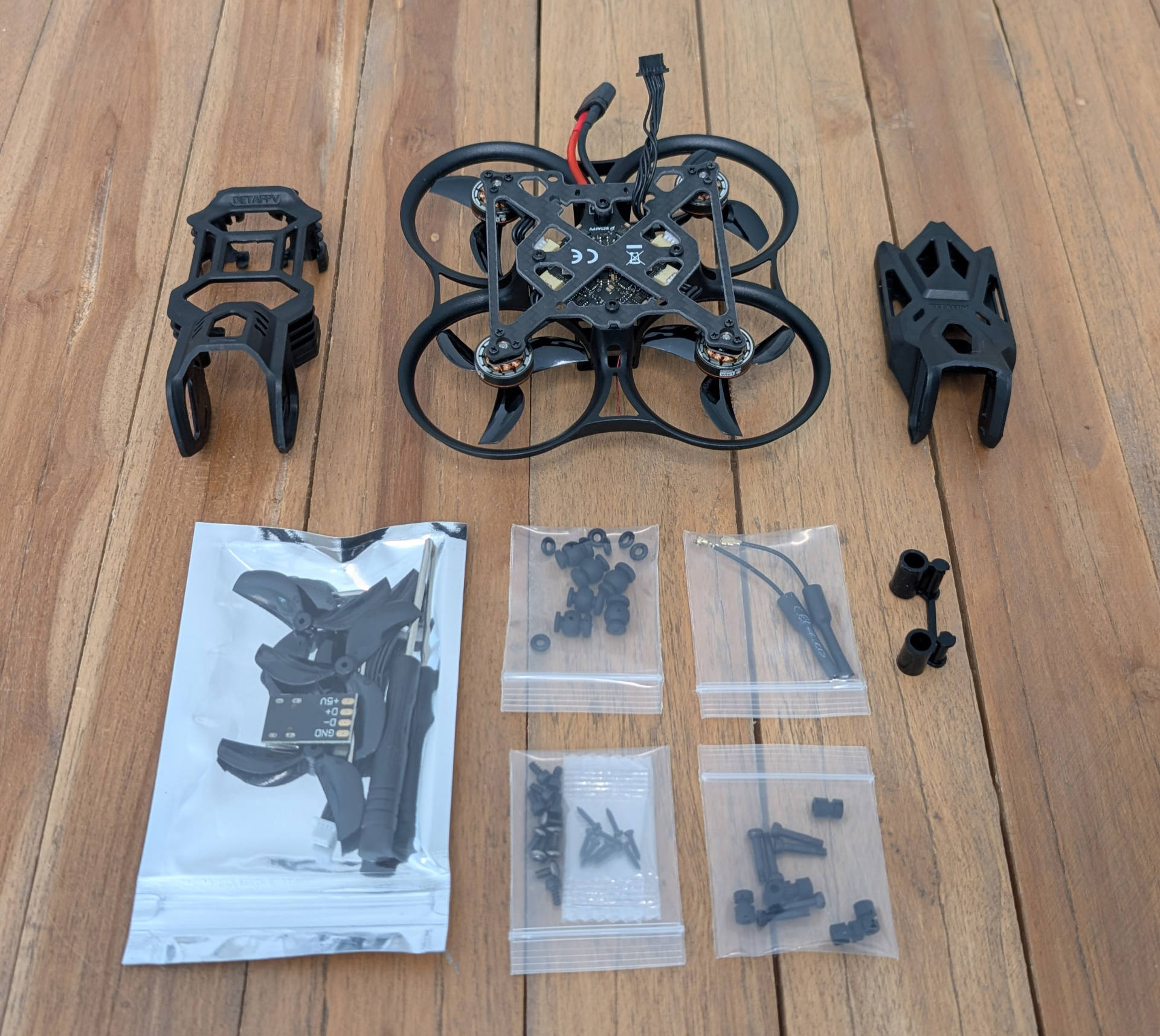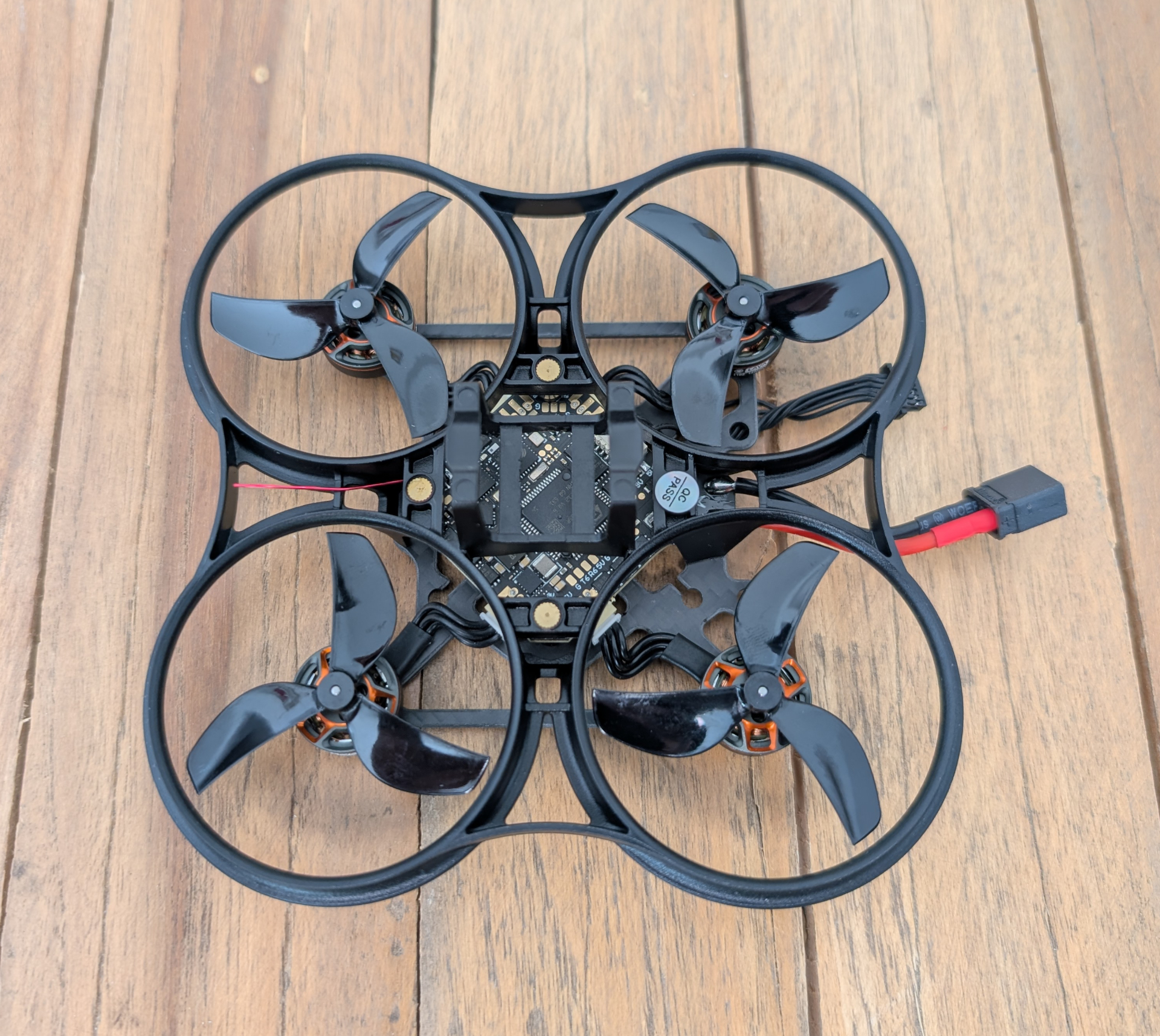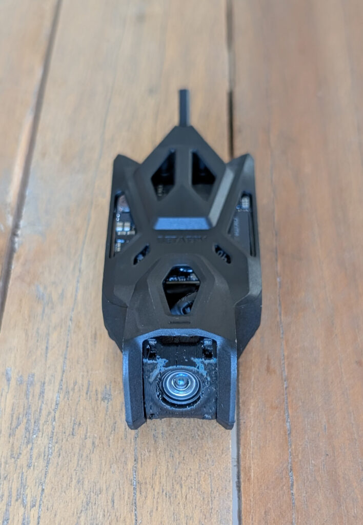 Au cœur, on retrouve un contrôleur de vol tout en un BetaFPV F4 2-3S 20A AIO FC V1. Il embarque un CPU F405, un gyroscope ICM42688P, une blackbox de 16 MB, un baromètre BMP280/DSP310, un capteur de tension et de courant, deux BEC (5V 3A@8V et 9V 2A@8V), des ESC 20A flashés en Bluejay, ainsi qu’un récepteur ELRS 2.4G en série (plus facile à flasher pour mettre à jour). Le port USB Type-C est déporté via un adaptateur SH1.0 4 pins, il faut donc penser à garder le petit câble/adaptateur dans le sac, sinon tuning/blackbox sur le terrain = rage.