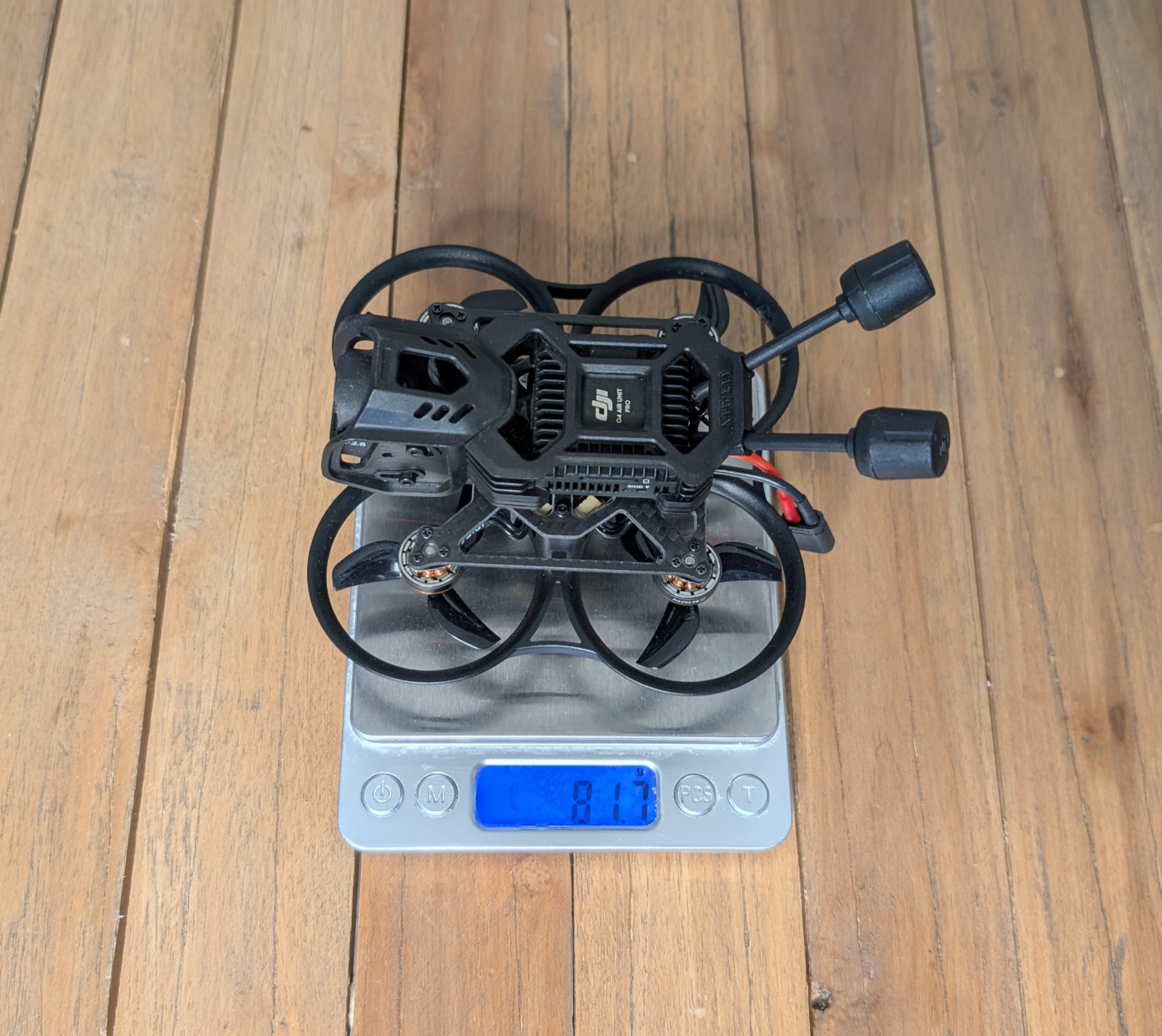 J’ai pesé le montage en O4 à 53,8 grammes tandis que la version Pro affiche 81,7 grammes avec les « grosses » antennes. On peut donc gratter encore quelques grammes avec les deux petites antennes linéaires fournies avec le BetaFPV Pavo Pico V2. Dans les deux cas, il faut ajouter 29,4 grammes de LiPo :