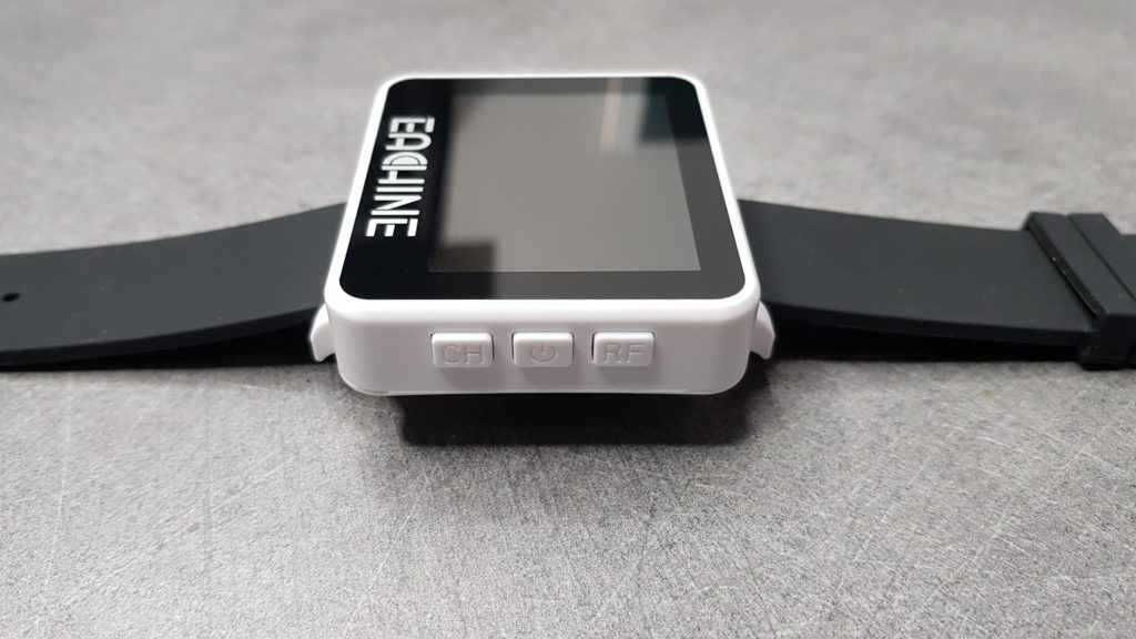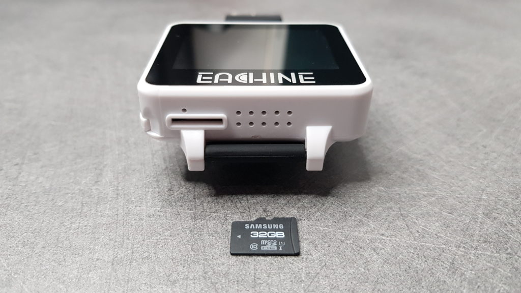 La montre Eachine RD200 embarque un DVR, et ça c’est très classe ! Nous testerons sur le terrain si ce DVR a les mêmes soucis de perte de frames, comme celui des lunettes Fatshark. L’enregistrement commence après une simple pression sur le bouton POWER de la montre, et s’arrête de la même façon. Pour cela, vous devez y mettre une carte microSD (de 32GO maximum). Il est aussi possible de relire vos enregistrements directement depuis la montre.