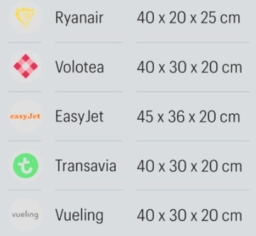 Voici un petit rappel des dimensions acceptées dans les vols low cost (attention, cette photo n’est valable qu’en date du 29/09/2025 et les compagnies peuvent encore changer les mensurations acceptées, c’est à vous de surveiller sur les conditions de votre vol avant de partir !).