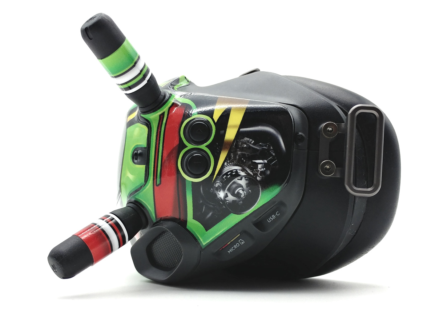 Enfin, et seul petit regret, le vinyle couvre la partie gauche des lunettes et les LEDs qui indiquent le canal sélectionné ne sont donc plus visibles. Rien de dramatique, car l’information est bien sûr affichée dans les lunettes. On pourrait certainement découper au cutter de petits cercles autour de chaque LED, mais nous ne voulions pas risquer de ruiner ce beau skin !
