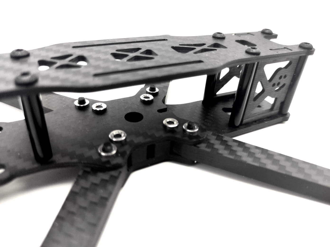 - Malgré un design split deck, le châssis reste assez spacieux, avec 22 mm de hauteur à l’arrière (contre 20 mm pour l’Apex et le AK-47 par exemple), et 30 mm à l’avant. Il y a un espace non négligeable entre la stack et la caméra qui devrait permet de case un ou 2 condensateurs et un buzzer autonome par exemple.