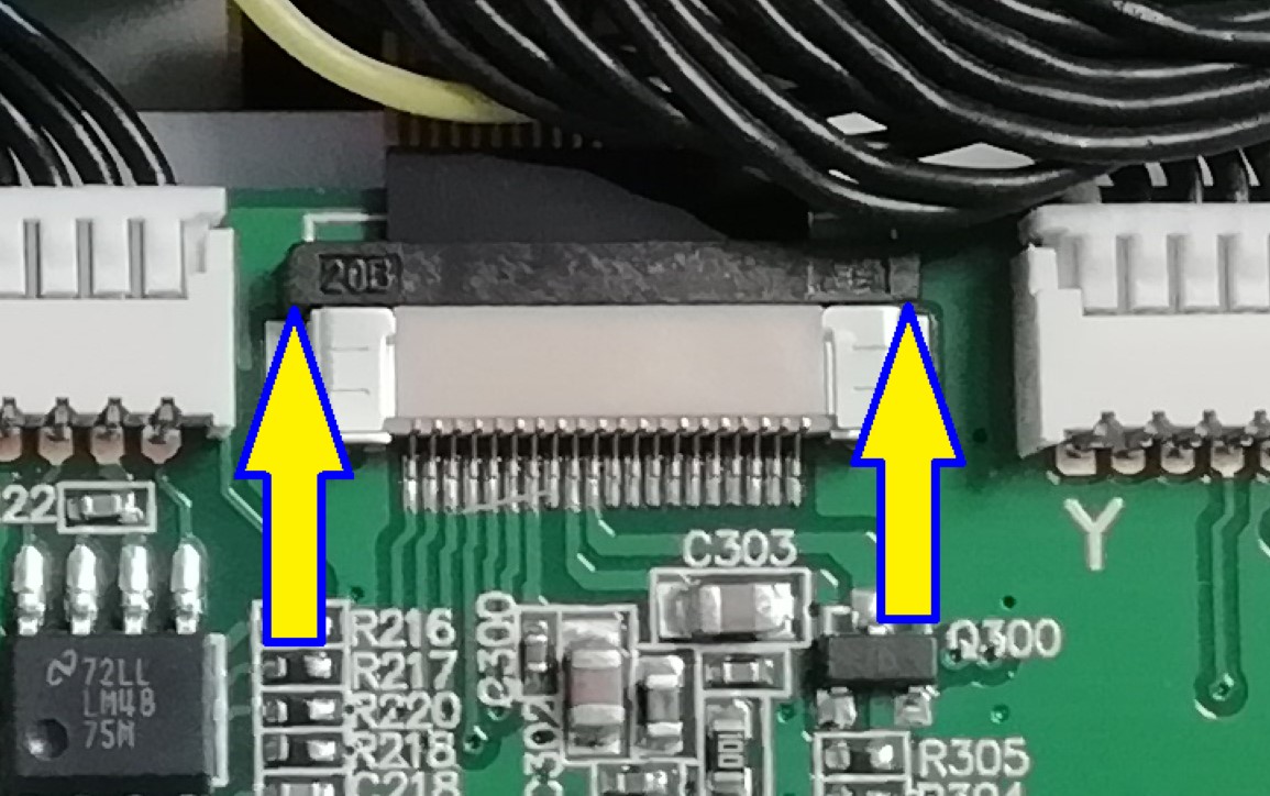 Pour ce dernier, il faut dégager vers l’avant dans le même sens que la flèche jaune la partie noire du connecteur afin de libérer la nappe.